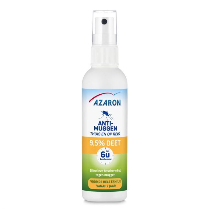 Azaron Deet Anti-Muggen Spray 9,5% biedt tot 6 uur effectieve bescherming tegen de meest voorkomende muggensoorten in Nederland. Voor sommige tropische muggen is de werkingsduur korter. De spray biedt gemiddeld 2 uur bescherming tegen de gelekoortsmug of denguemug (welke o.a. het zikavirus kunnen overdragen), en 5 uur bescherming tegen de malariamug.