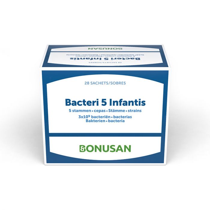 Bacteri 5 Infantis is een complete samenstelling voor de ondersteuning aan de start van de eerste levensfase. Het bevat alleen wetenschappelijk onderzochte bacteriestammen speciaal voor baby’s, jonge kinderen en zwangere vrouwen. Bacteri 5 Infantis biedt een complete samenstelling voor ondersteuning aan de start van de eerste levensfase. Het bevat uitsluitend wetenschappelijk onderzochte bacteriestammen speciaal voor jonge kinderen, baby’s en zwangere vrouwen. Bonusan Pro-bacteri 5 Infants Sachet 3 G bevat geen synthetische zoet- of smaakstoffen en is lactosevrij.