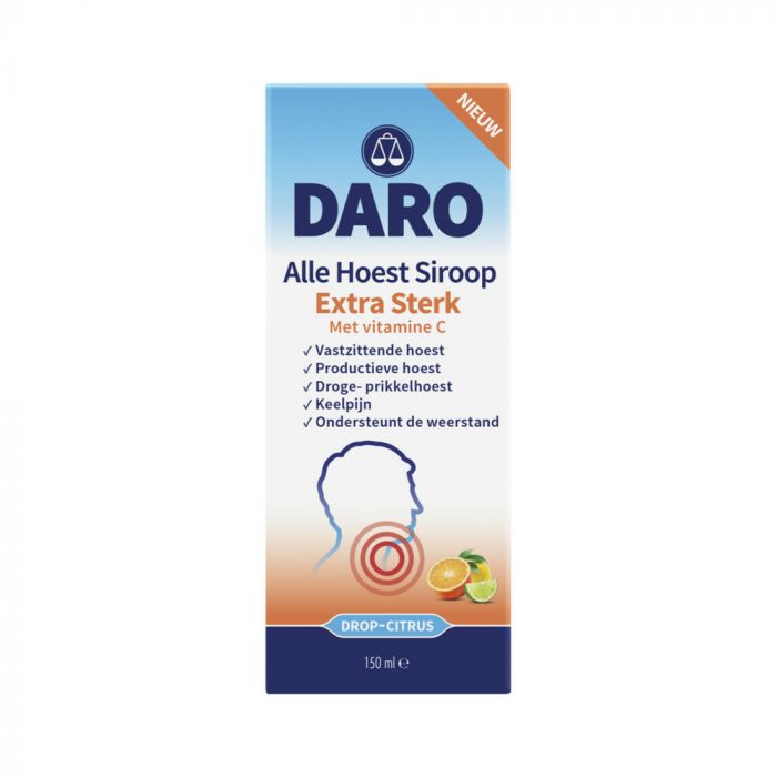 Daro Alle Hoest Extra Sterk met vitamine C is een zelfzorgend medisch hulpmiddel op basis van Polysac-Active voor de behandeling van ieder type hoest en keelpijn. De siroop creëert een beschermend filmlaagje in de keel dat zorgt voor een snelle verlichting van droge- en kriebelhoest door de verzachtende eigenschappen. Daarnaast wordt eventueel taai slijm opgelost waardoor vastzittende- en productieve hoest verdwijnen.