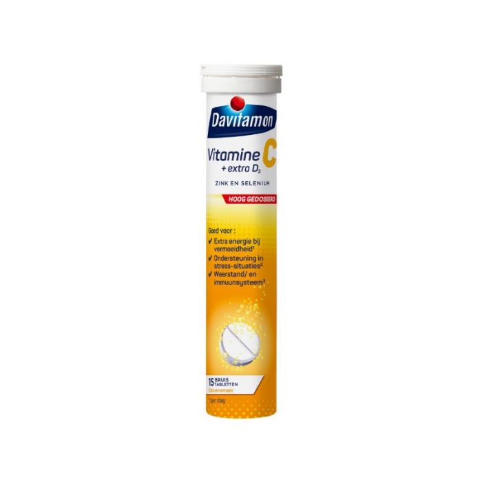 Davitamon Vitamine C Forte + Extra D3 Bruistablet is een voedingssupplement en combineert een hoge dosering vitamine C met vitamine D, selenium en zink. De hoge dosering vitamine C heeft een positief effect op de weerstand bij lichamelijke inspanning. Vitamine C draagt ook bij aan fitheid: het activeert de natuurlijke energie in het lichaam. Zowel vitamine C, vitamine D, selenium en zink ondersteunen de afweer en helpen het natuurlijk afweersysteem van de lichaamscellen.