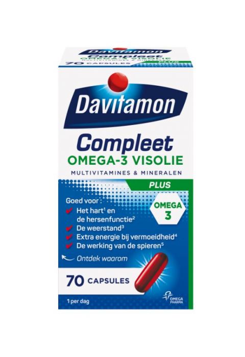 Davitamon Compleet Omega 3 Visolie is een multivitamine met mineralen + zuivere visolie met 60% omega-3 vetzuren. Voor extra weerstand. Helpt hart en bloedvaten gezond te houden.