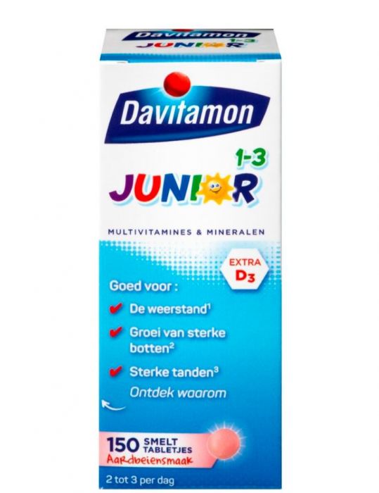 Omdat groeien niet vanzelf gaat, is het belangrijk dat kinderen voldoende vitamines binnen krijgen. Een voedingssupplement kan hierbij helpen. Speciaal voor kinderen die nog leren kauwen heeft Davitamon Junior 1-3 smelttabletjes ontwikkeld. Het is afgestemd op de specifieke behoeften van kinderen vanaf 1 jaar. Met Davitamon Junior 1-3 geef je dan ook je kind een goede aanvulling op de voeding.