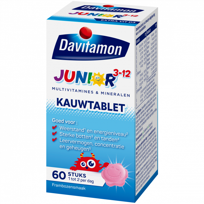 Bevat per dagdosering van 1-2 kauwtabletten: 250-500 mcg vitamine A; 0,25-0,5 mg vitamine B1; 0,35-0,7 mg vitamine B2; 3,5-7 mg vitamine B3; 1,5-3 mg vitamine B5; 0,35-0,7 mg vitamine B6; 6-12 mcg vitamine B8; 75-150 mcg vitamine B11 (foliumzuur); 0,65-1,3 mcg vitamine B12; 22,5-45 mg vitamine C; 2,5-5 mcg vitamine D; 3,6-7,2 mg vitamine E; 10-20 mcg vitamine K; 2,1-4,2 mg ijzer; 150-300 mcg koper; 1,5-3 mg zink; 8,25-16,5 mcg selenium; 29-58 mg magnesium; 0,3-0,6 mg mangaan; 7,5-15 mcg molybdeen; 30-60 mg calcium; 22,5-45 mcg jodium en 6-12 mcg chroom.