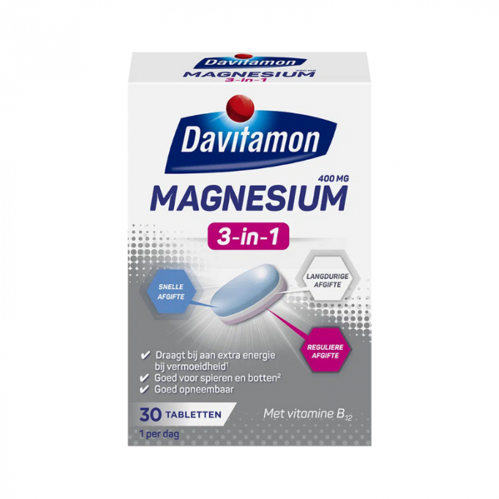 Davitamon Magnesium 3-in-1 is geschikt voor volwassenen en ondersteunt energie, spieren en botten met een unieke afgifte technologie.