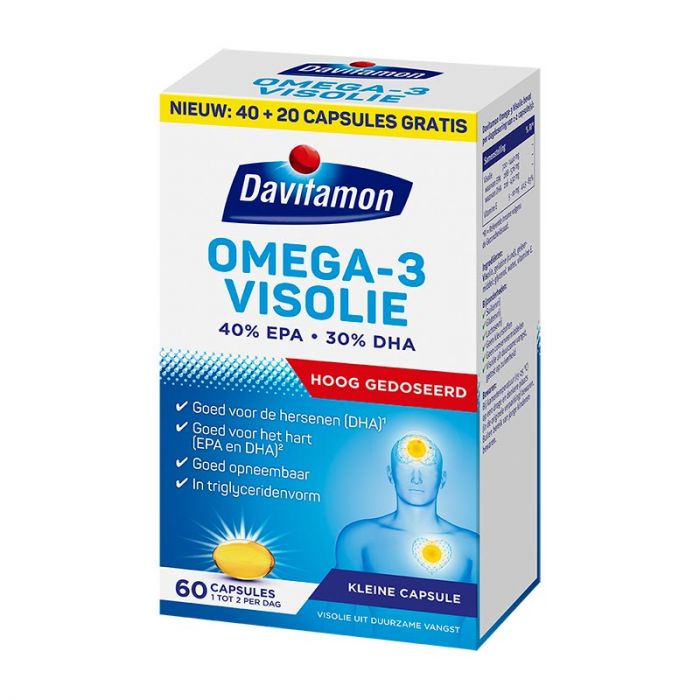 Davitamon Omega 3 Visolie Capsules zijn goed voor de hersenen en het hart.