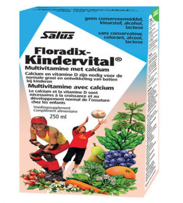 Wortel, brandnetel, spinazie, waterkers, koriander, kamille, anijszaad, perensap, sinaasappelsap, moutextract, druivensap, acerolasap, rozenbottelextract, carobemeel en essence van cacao. Kindervital is gezoet met ahornsiroop: er is dus geen suiker toegevoegd.