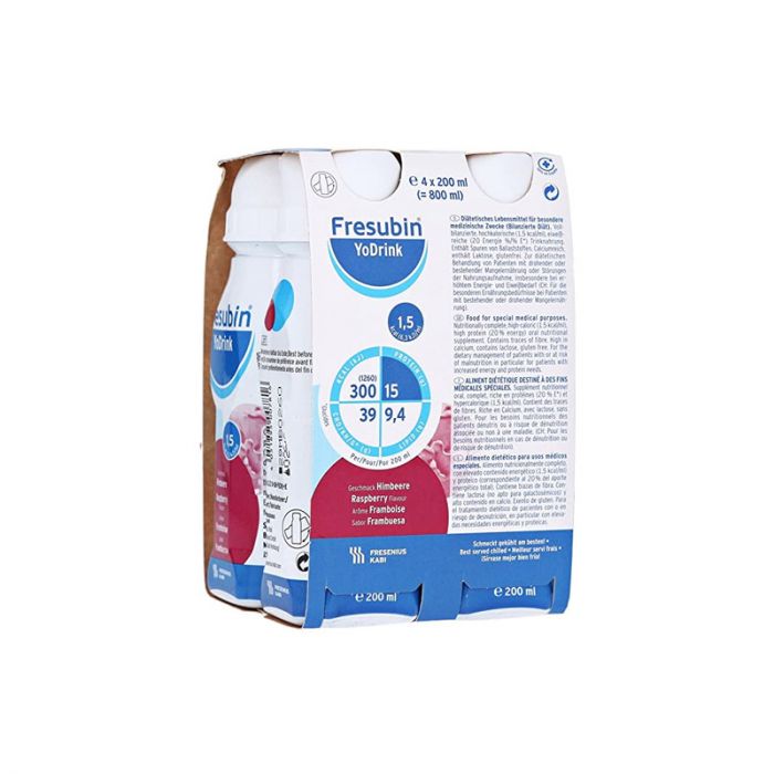 Fresubin YoDrink is een volledige, energie- (1,5 kcal/ml) en eiwitverrijkte (20 energie%) drinkvoeding. De YoDrink bevat sporen van vezels, bevat lactose en is glutenvrij. Het is voor de dieetbehandeling van patiënten met (risico op) ondervoeding, in het bijzonder voor patiënten met een verhoogde energie- of eiwitbehoefte.