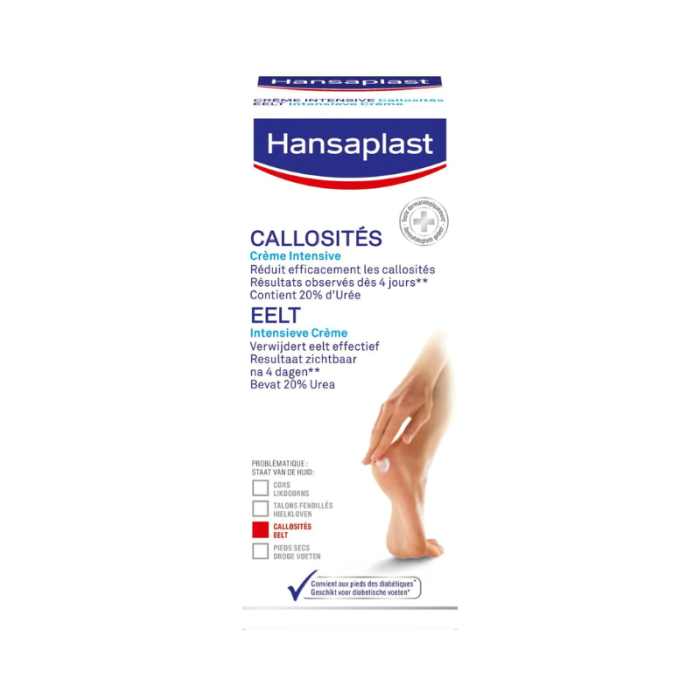 Hansaplast Anti-Eelt Intensieve Crème bevat een innovatieve combinatie van een zeer effectieve, eelt verminderende concentraat UREA (20%) en de Aquaporin technologie. De formule stimuleert de hydratatie van de huid en biedt een langdurig resultaat. In slechts 4 dagen wordt de huid voelbaar zachter en soepel.