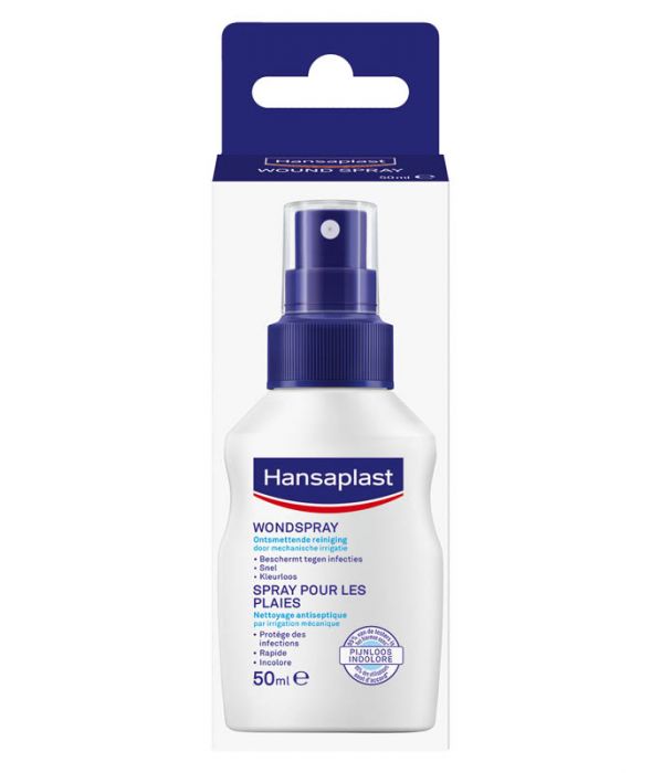 Het reinigen van een wond een belangrijke eerste stap voor goede wondgenezing en wordt aanbevolen voor alle soorten wonden, zelfs bij een kleine oppervlakkige wond. Deze spray is makkelijk te gebruiken voor het ontsmetten en reiniging van kleine acute wondjes zoals sneeën, schaafwonden, eerste en kleine tweede-graads brandwonden en open blaren. De spray kan ook worden gebruikt voor chronische wonden en bij wondzorg na een operatie volgens de instructies van je arts. Daarnaast helpt Hansaplast Wondspray ook om korsten of stollingen te verwijderen. Doordat de spray geen alcohol bevat prikt het niet tijdens het aanbrengen en droogt de huid niet uit. Hansaplast Wondspray is een pijnloze en effectieve manier om wonden te reinigen van vuil en bacteriën en infecties van de wond te voorkomen.