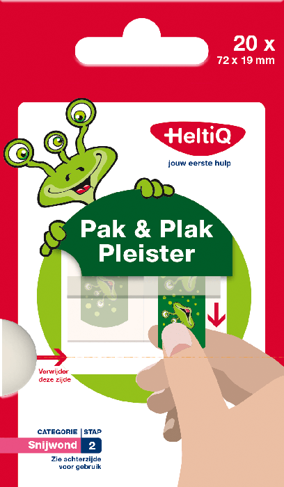 Met de HeltiQ Pak & Plak Pleisters Groen behandel je heel eenvoudig en hygiënisch kleine (snij)wondjes. De pleisters zijn groen van kleur, voorzien van vrolijke kikkertjes en zijn verpakt in een handige ophangkaart. Deze kaart bevat twee rijen met pleisters. Je verwijdert gemakkelijk de folie en trekt zo een voor een de pleisters uit de kaart. Dit proces zou je met een hand kunnen doen. Zo is het zeer eenvoudig en hygiënisch om de pleister met één hand te kunnen opplakken.