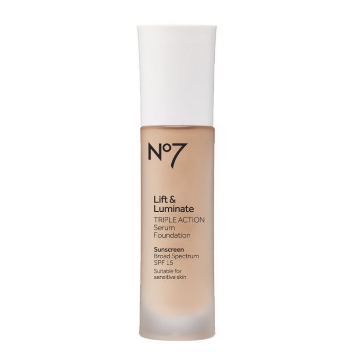 No7 Lift & Luminate Triple Action Serum Foundation pakt de drie belangrijkste tekenen van huidveroudering aan. Het verbergt fijne lijntjes en rimpels, ouderdomsvlekken en pigmentatie. De comfortabel aanvoelende foundation bevat: