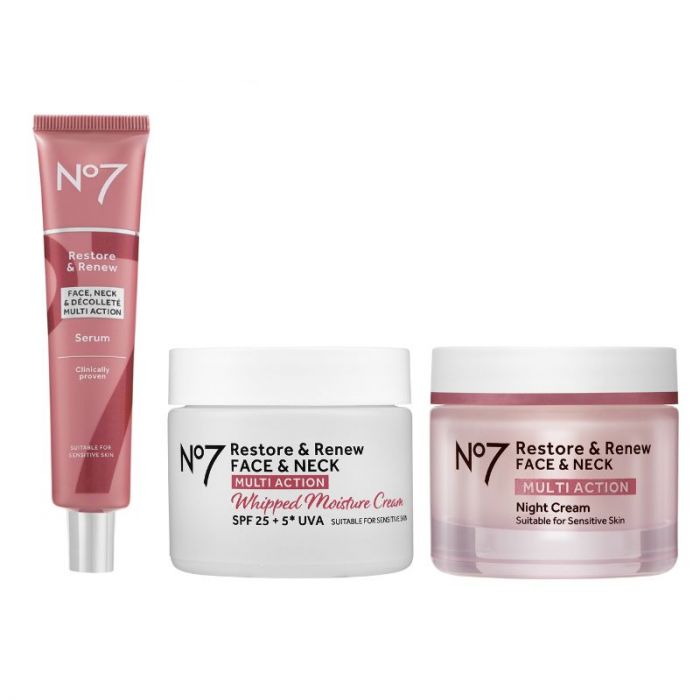 No7 Restore & Renew Face & Neck Multi Action Serum 30ml: Is een dagelijks multi-action serum, met bewezen resultaten voor zowel het gezicht als de hals. No7 Restore and Renew Face & Neck Multi-Action Serum geeft een klinisch bewezen steviger gevoel en een zichtbaar jongere, zachtere huid. Het serum is daarom bedoeld voor de vrouw die er net zo jong uit wil zien, als dat ze zich voelt.