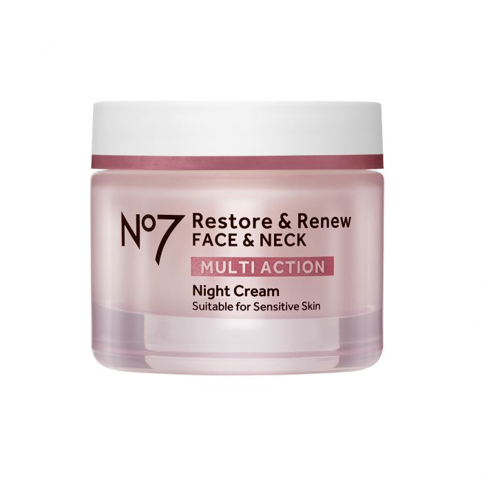 Ontdek No7 Restore & Renew Face & Neck Multi Action Nachtcrème, boordevol technologie van ons klinisch bewezen Multi Action Serum om de belangrijkste zichtbare tekenen van huidveroudering op zowel het gezicht als de nek aan te pakken.