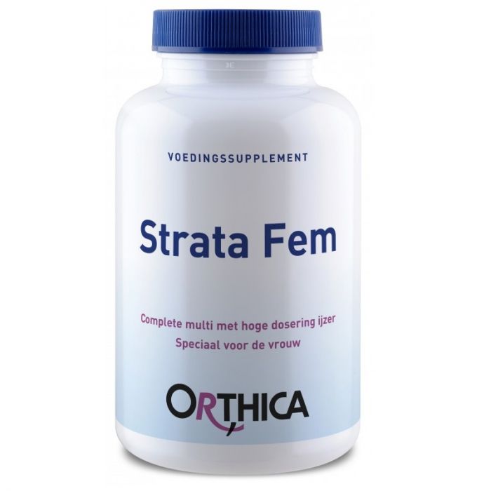 Orthica Strata Fem is een complete multi speciaal voor de vrouw. Strata Fem voorziet het lichaam van extra ijzer dat bijdraagt aan de normale vorming van rode bloedcellen en hemoglobine. Bovendien bevat het o.a. gestandaardiseerd druivenpitextract ter ondersteuning van de huid en de bloedvaten.