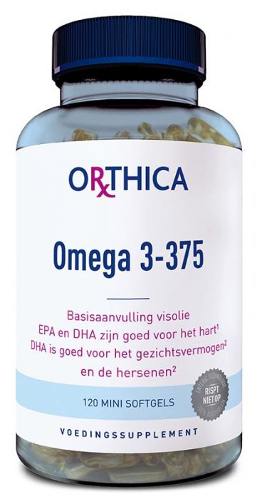 In sommige gevallen kan het zijn dat omega 3-vetzuren verminderd in de voeding aanwezig zijn, bijvoorbeeld als je geen vis eet. De Gezondheidsraad beveelt per dag 200 mg visvetzuren (EPA en DHA) aan, wat gelijk staat aan 1x per week een portie vis. Bij voorkeur vette vis. Omega 3-375 bevat 375 mg omega 3-vetzuren uit gezuiverd visolieconcentraat (EPA en DHA) met natuurlijke tocoferolenmix en is geschikt als dagelijkse basisaanvulling op de voeding. Visolie-supplementen van Orthica voldoen aan strenge kwaliteits- en duurzaamheidsvoorwaarden.