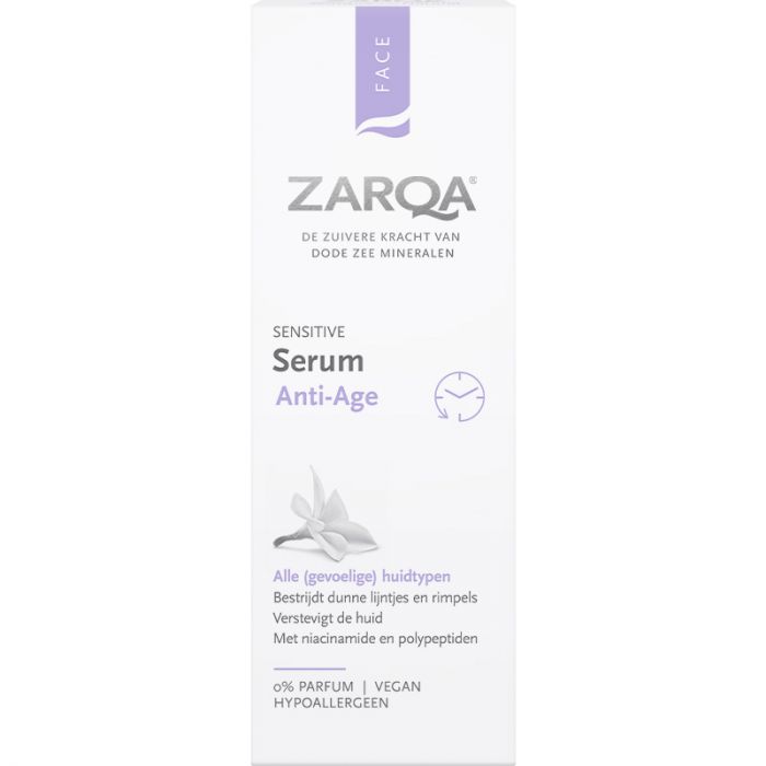 ZARQA Serum Anti-Age, met een mineralencomplex, maakt de huid gladder en vermindert rimpels. Het heeft een kalmerende en herstellende werking. Het antirimpelcomplex met polypeptiden verbetert zichtbaar de kwaliteit van de huid door de diepte van rimpels te verminderen en de teint en elasticiteit van de huid te verbeteren. Dit serum heeft een lichte textuur die snel in de diepere huidlagen doordringt. Na gebruik kan de huid de actieve ingrediënten van verzorgende crèmes optimaal opnemen.